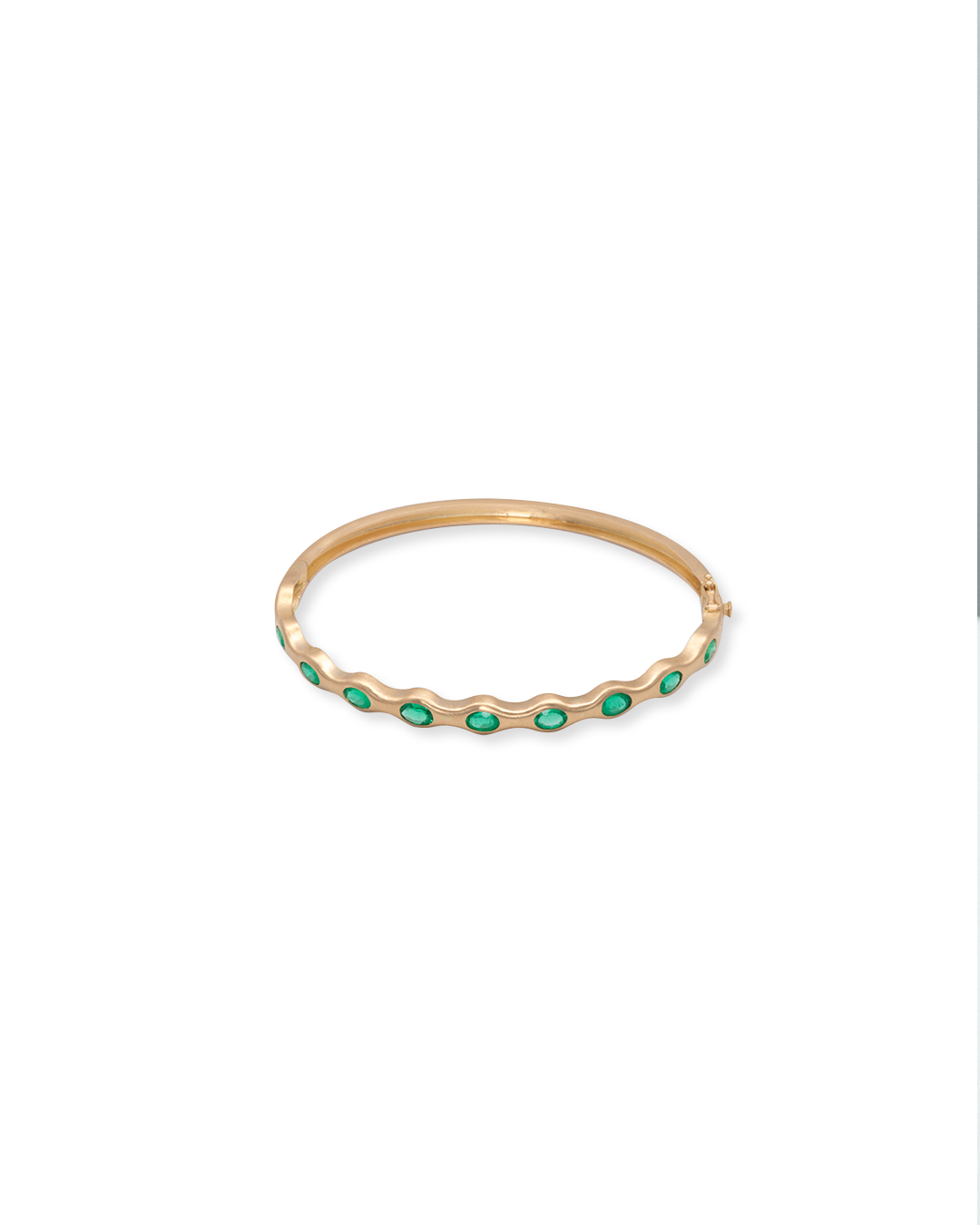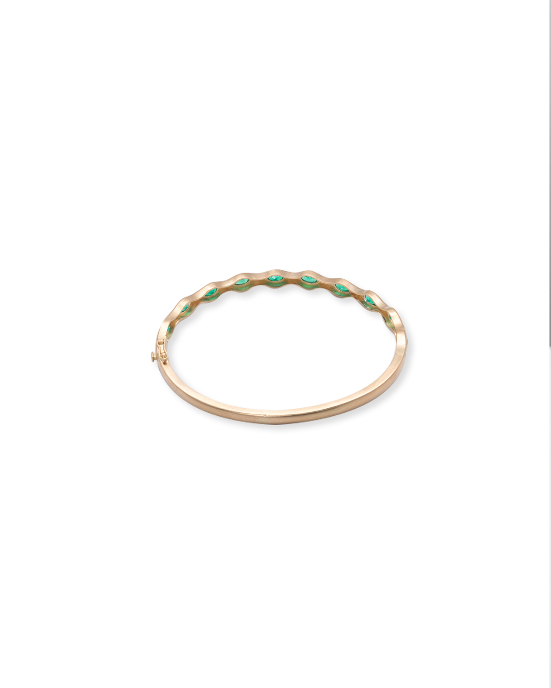 Wrapped in the warmth of brushed gold, these vivid Muzo emeralds offer a whisper of timeless luxury. A sophisticated statement piece destined to become a cherished heirloom.