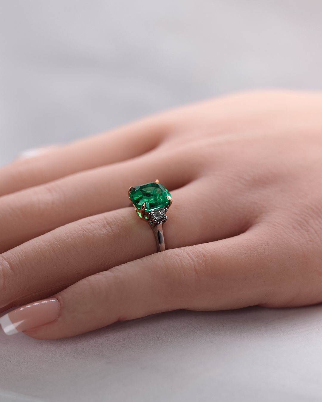 A timeless trinity design features a majestic 3.60-carat emerald flanked by trapezoid diamonds. This bi-color gold masterpiece symbolizes a legacy of enduring elegance and sophisticated romance.