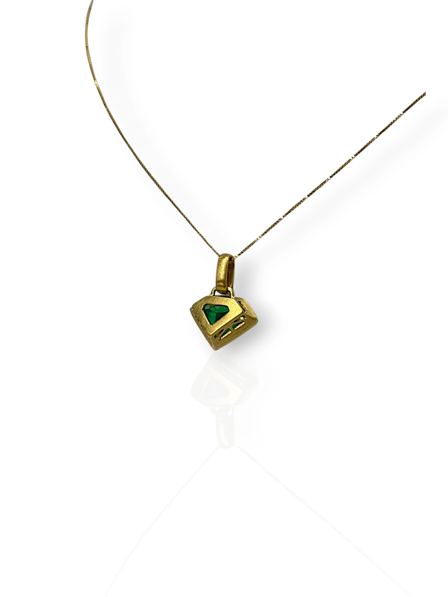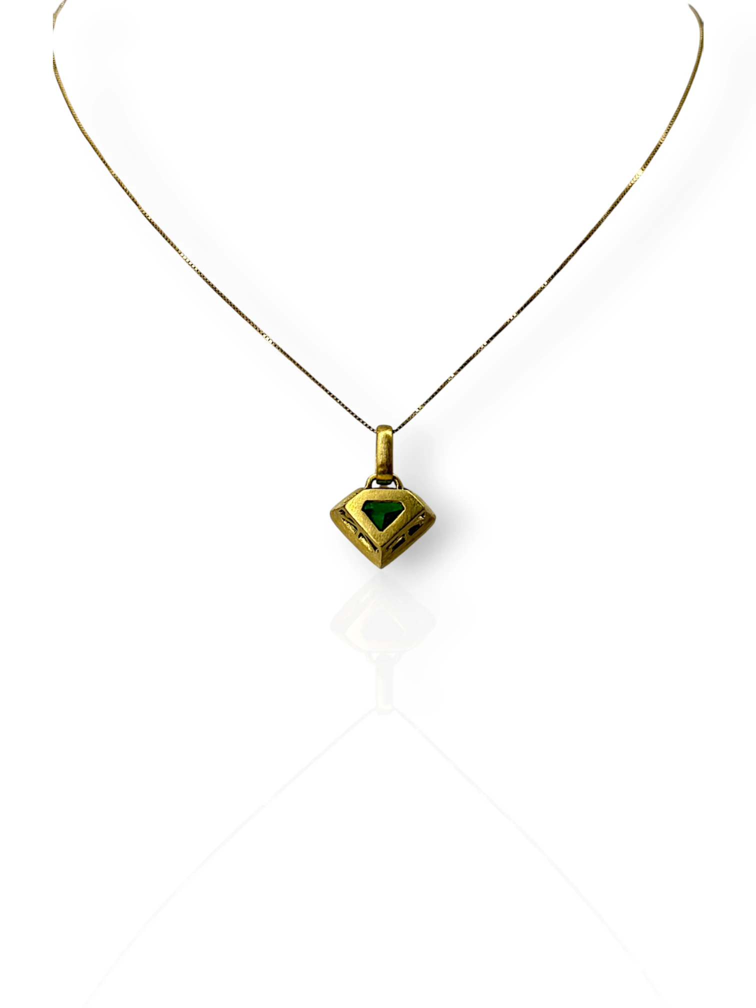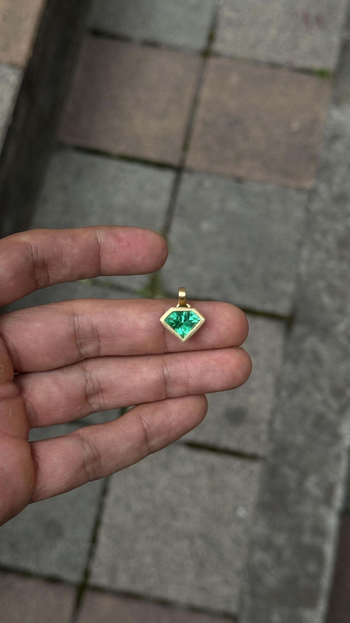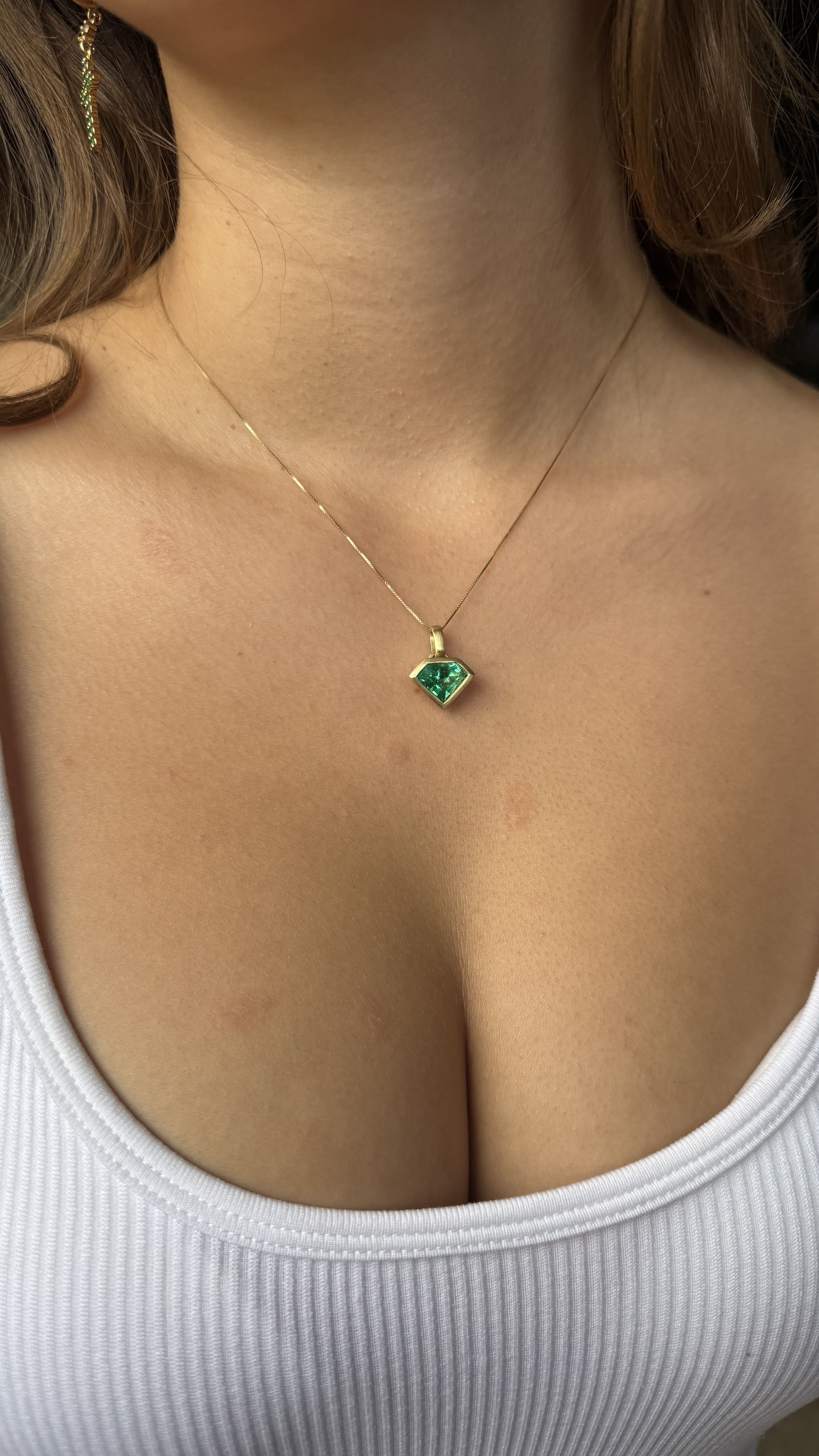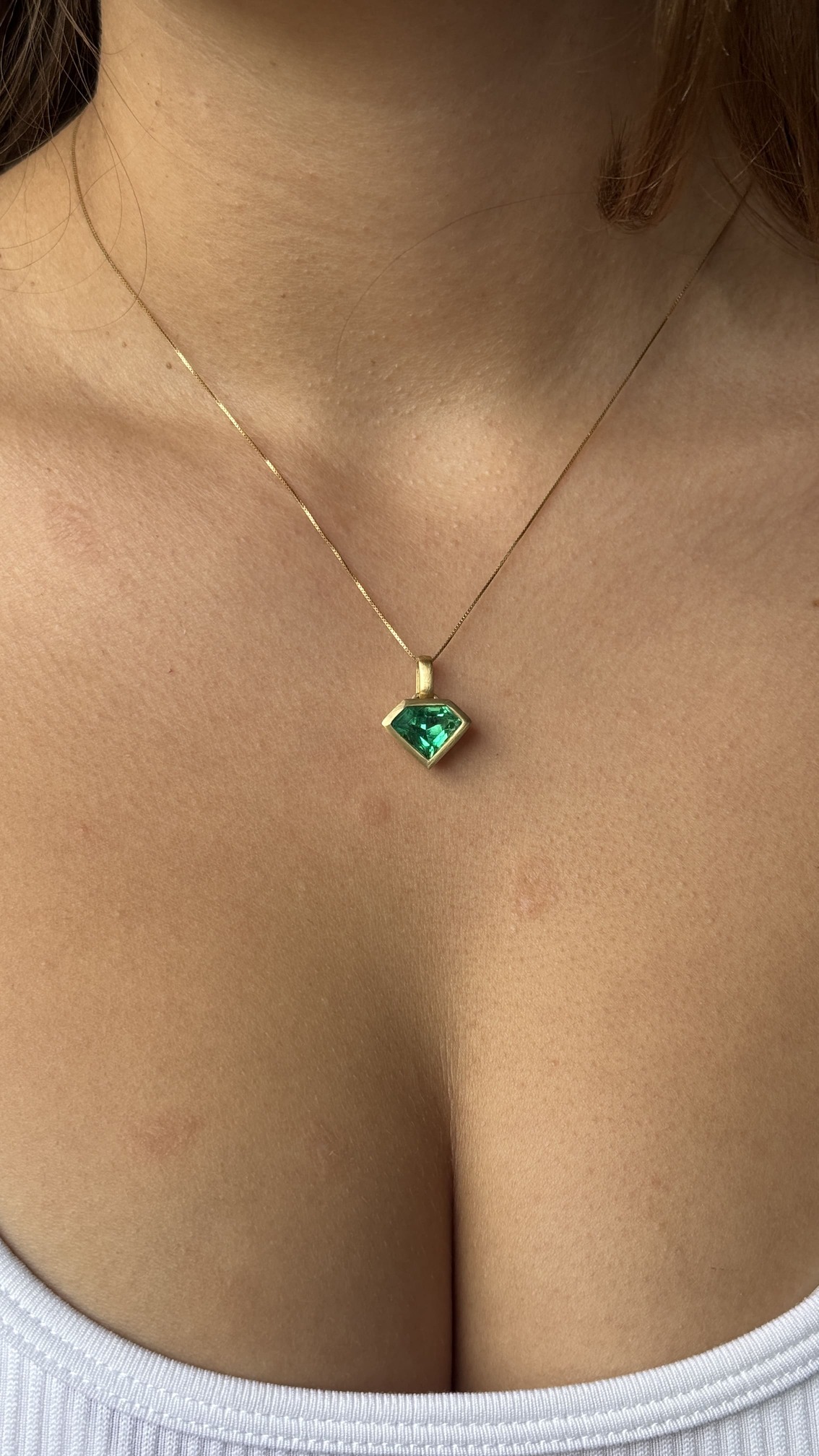 A fancy shield-cut pendant showcases a striking gemstone with bold, angular facets in a shield-like silhouette. Elegant and contemporary, it combines geometric precision with timeless sophistication, making it a distinctive statement piece.