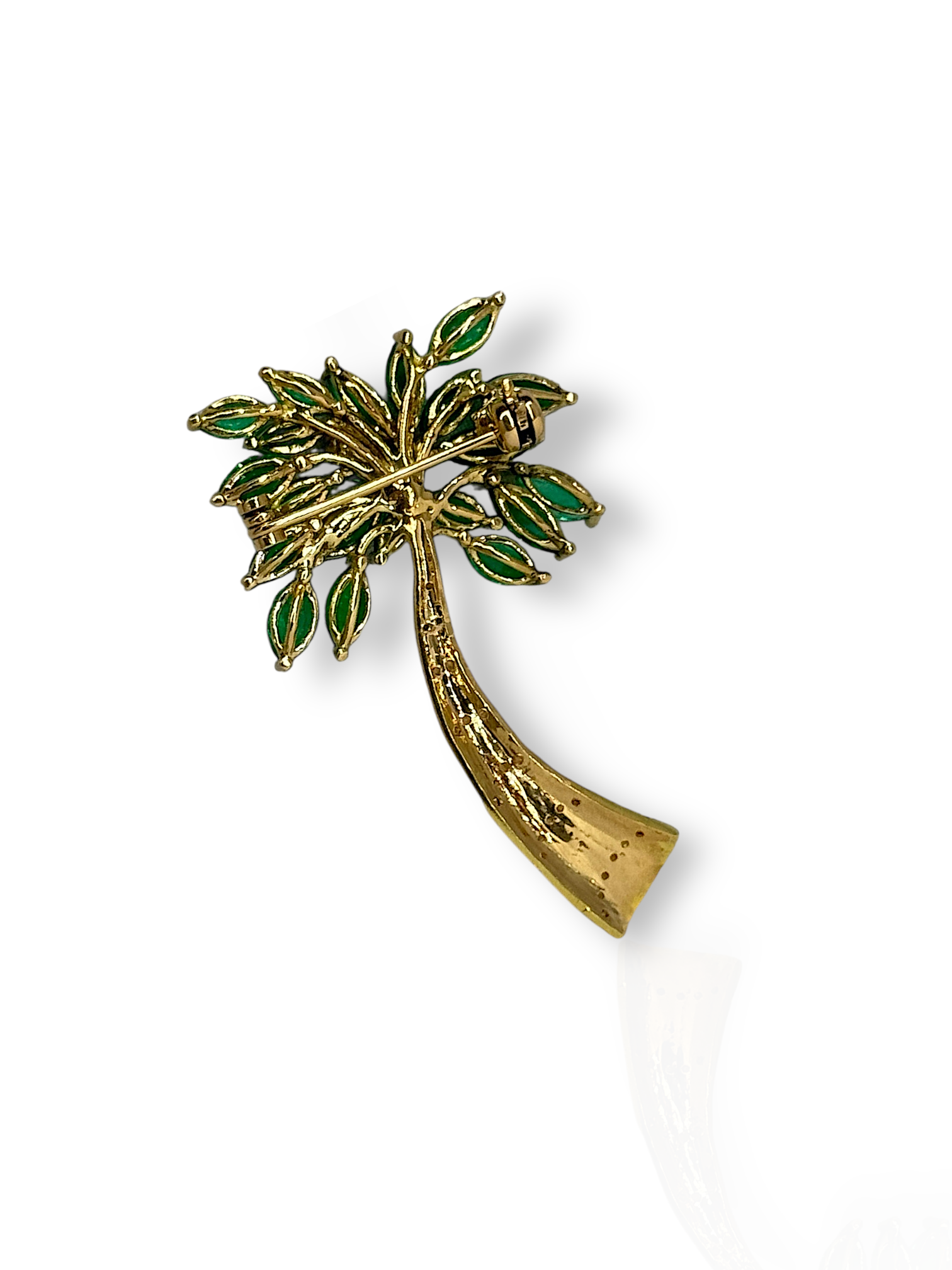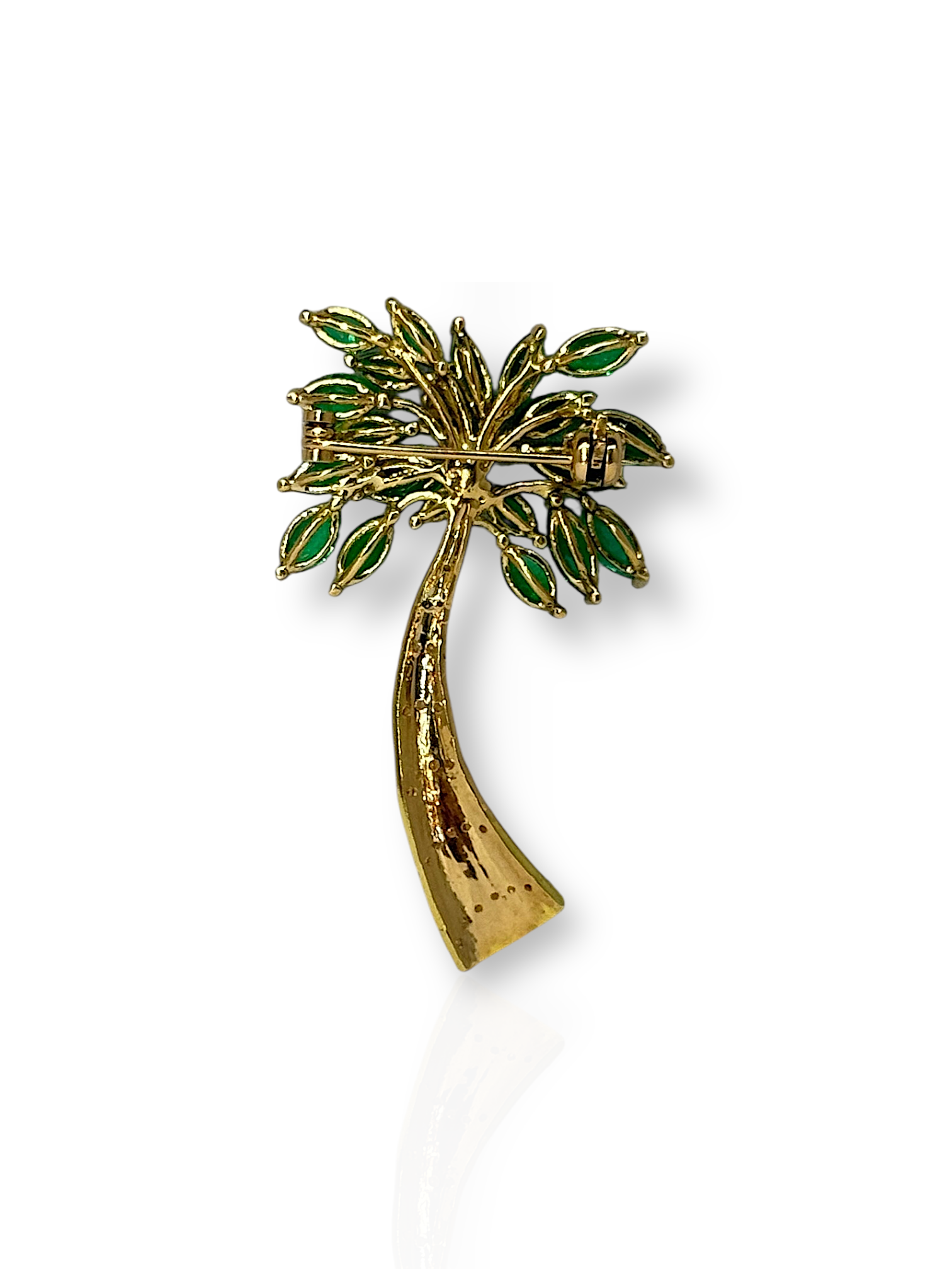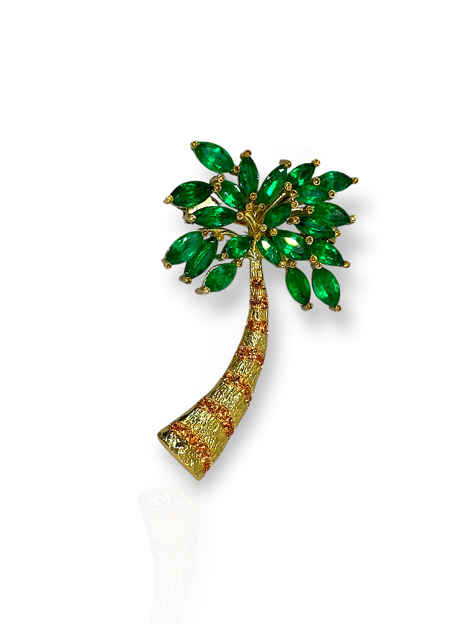 This exquisite palm tree brooch–pendant is a vibrant tribute to tropical elegance, featuring a lush arrangement of Colombian emeralds, blue sapphires, and yellow diamonds. Expertly crafted, each gemstone is meticulously placed to mimic the natural flow and texture of palm fronds and a graceful trunk, blending vivid greens, deep blues, and radiant gold tones.